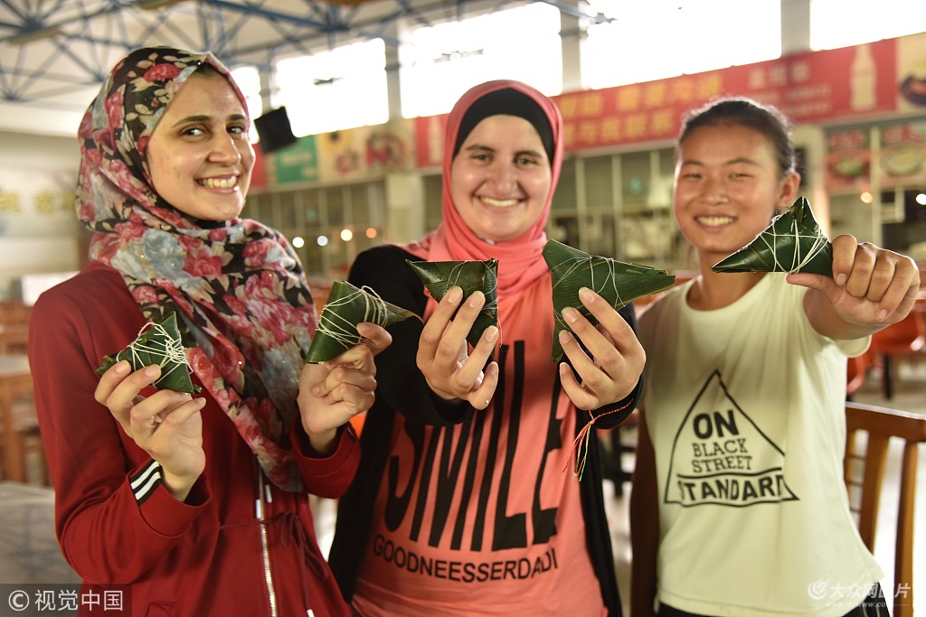 2018年6月15日,山東聊城,留學生和志愿者在展示包的粽子。趙玉國/視覺中國