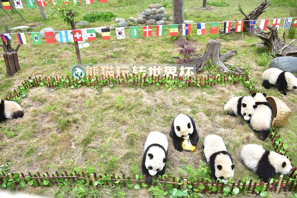 四川阿壩:熊貓玩轉世界杯開賽 “滾滾”集體踢足球