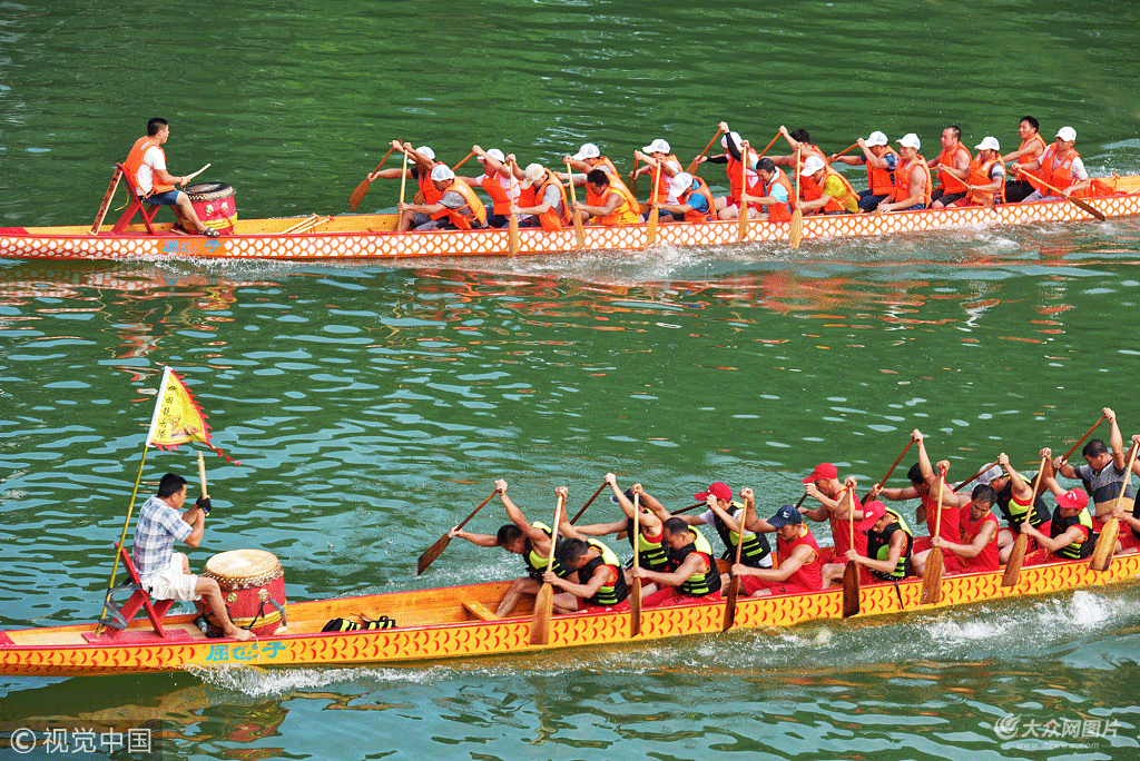 2018年6月17日,桂林,端午節(jié)期間,在興安縣界首鎮(zhèn)的湘江河上,幾十條龍舟在急急的鼓聲中展開了激烈的角逐。今年端午節(jié)也是桂林龍舟“十年一大劃”的日子,來自界首各村鎮(zhèn)的15支龍舟隊(duì)24條龍舟參加了這一傳統(tǒng)民俗活動(dòng)。