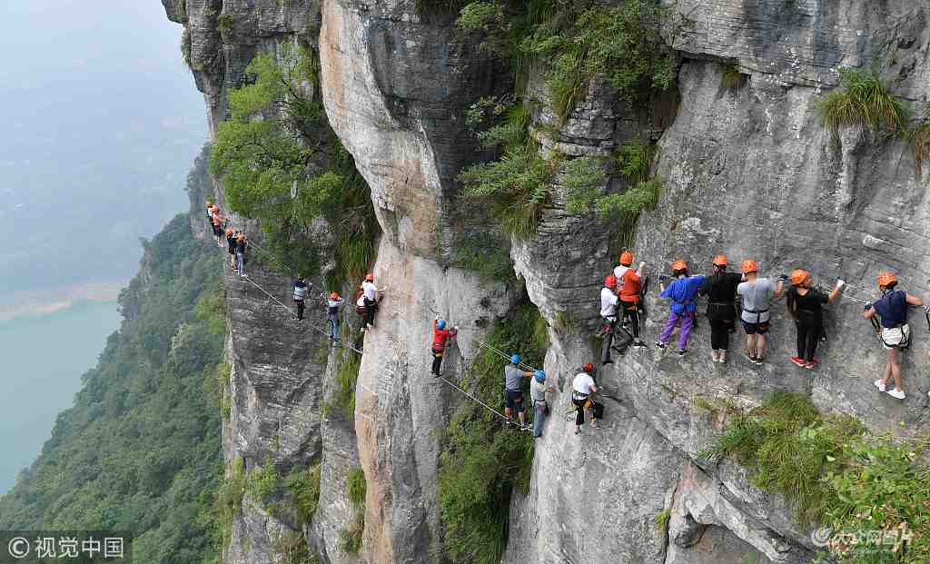 2018年6月18日,湖北恩施,雞公嶺飛拉達(dá)攀巖戶外運(yùn)動(dòng)基地位于湖北省恩施土家族苗族自治州建始縣花坪鎮(zhèn),攀巖地點(diǎn)集雄奇險(xiǎn)秀風(fēng)光于一體,垂直距離江面約550米,三條長為650米、850米、900米的攀巖線路,吸引了眾多戶外運(yùn)動(dòng)愛好者前來體驗(yàn)。圖片作者:楊順丕/視覺中國