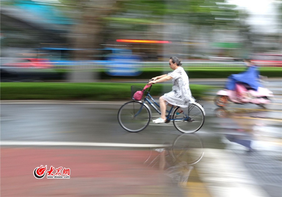 今天下午13:40左右,大雨伴著陣風突襲濟南,路上幾位騎電動車行人躲避不急,一路飛馳。(大眾網-山東24小時客戶端 見習記者 儀首歌)