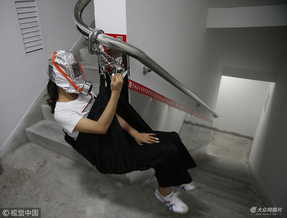 2018年8月23日消息,近日,西安市首個高樓應急逃生系統在某小區內啟用,分為逃生裝置和配套裝置兩大部分。逃生裝置由扶手懸掛逃生器和逃生防毒防塵口罩組成,配套裝置包括專用扶手、側壁護板和立柱三部分,兩套裝置均安裝于消防通道內。 梁萌 攝 圖片來源:視覺中國