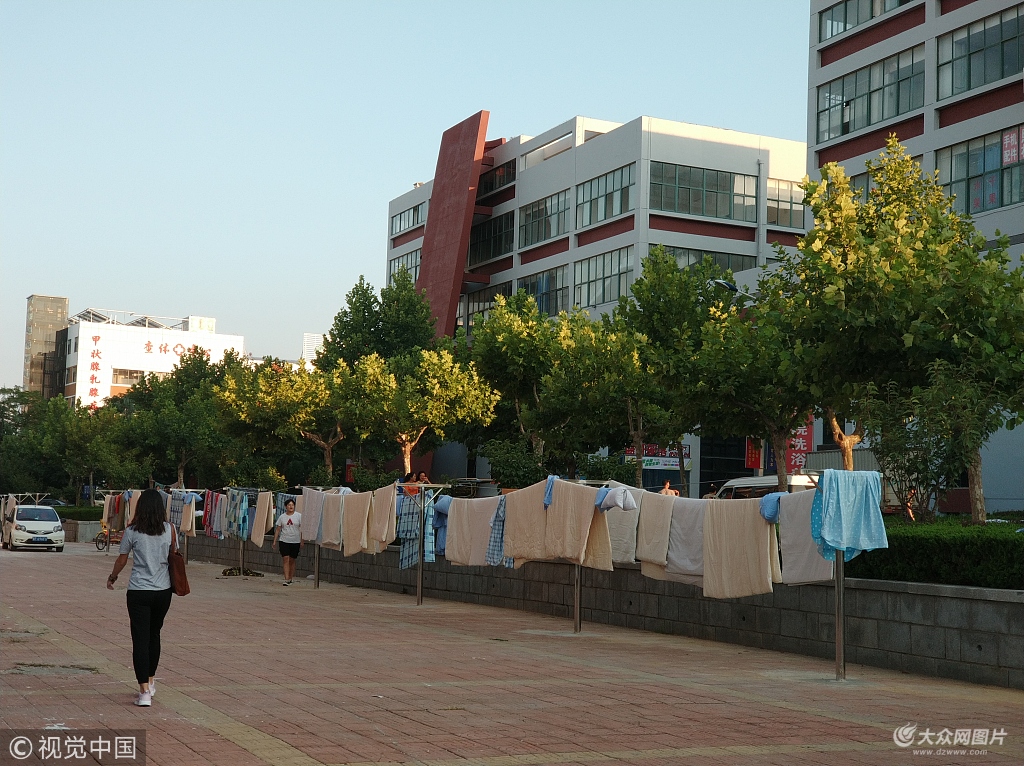 2018年8月25日,山東煙臺某學院開學,不少學生趁著天氣晴朗,將自己被子晾曬,不少住陰面的學生拿到樓下涼曬,幾乎能放被子的地方都被學生搭曬。