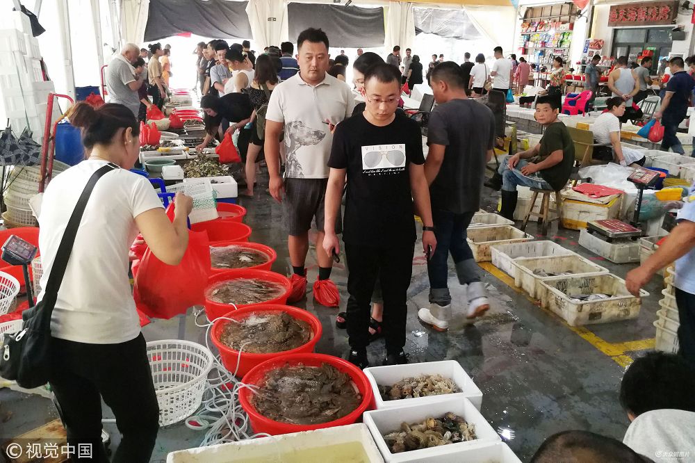 2018年9月3日,山東青島西海岸新區積米崖漁港,開漁后首批歸來的大漁船帶回一船船新鮮的海鮮,漁港碼頭內的海鮮市場,聚集了眾多前來購買海鮮的市民,在經歷了4個月的休漁后,他們都想趁剛開海品嘗一下久違的新鮮海鮮。