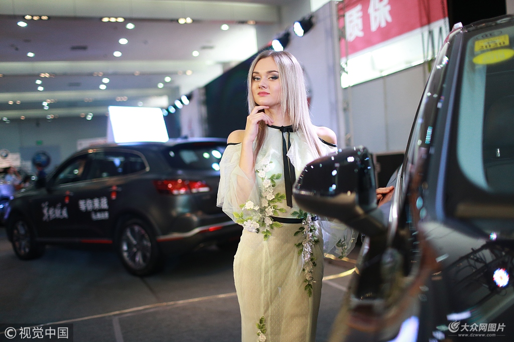 2018年9月9日,山東日照,秋季車展正在如火如荼的進行,現場還請來了洋模特助陣提升人氣,金發碧眼的洋模特閃亮車展現場。