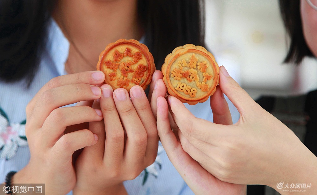 2018年9月22日,杭州,浙江農(nóng)林大學(xué)的師生在展示、欣賞“校徽”版月餅。