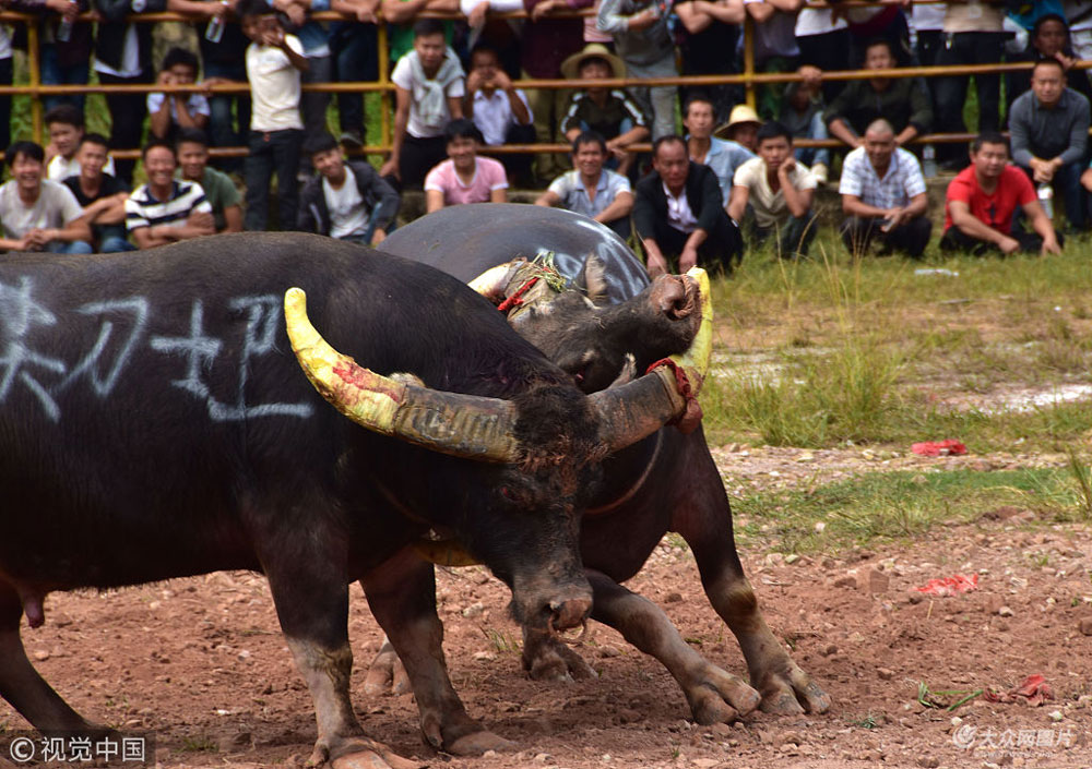 2018年10月4日,貴州省黔東南苗族侗族自治州從江縣下江鎮歸江斗牛塘舉行斗牛比賽活動,來自從江、榕江及雷山等地的26對水牯牛在這里比拼,吸引了眾多游客及周邊村民前來觀看,共度假日。