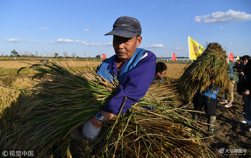 2018年10月10日,山東青島,海水稻研發中心10日開始收割在青島市城陽區鹽堿地稻作改良示范基地試種的海水稻,專家組現場對編號為1803的水稻材料進行測產,實打畝產量為261.39公斤,理論畝產量為669.24公斤。