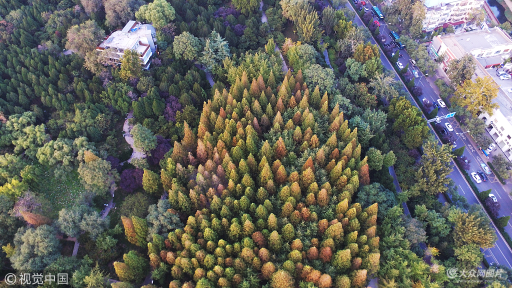 2018年10月19日傍晚,俯瞰濟(jì)南泉城公園,一片紅杉樹(shù)在秋日陽(yáng)光下呈現(xiàn)出五彩繽紛的大自然色彩,美到令人窒息。如同一位藝術(shù)家在樹(shù)林里作畫(huà),構(gòu)成一幅幅絕美的油畫(huà)。