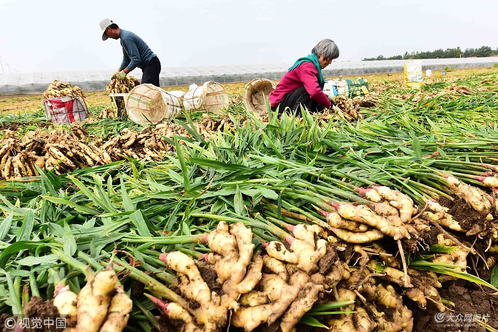 2018年10月21日,山東省濰坊青州市東夏鎮西夏村農民在裝卸大姜。