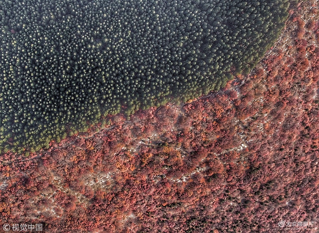 2018年11月3日,金秋時節,位于山東省濟南市楔子山山脊一帶植被呈現出“平分秋色”的壯美景象:一側紅色一側綠色,令人稱奇,成為濟南秋天里網紅好去處。圖為無人機航拍濟南楔子山“雙色”植被。