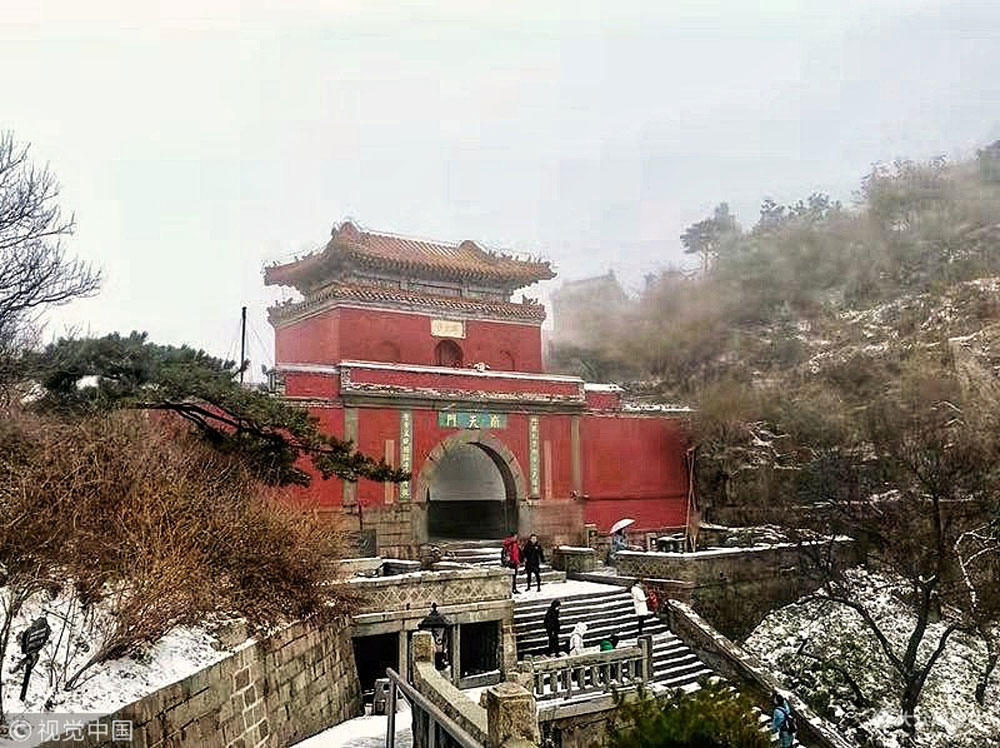 山東泰安喜降瑞雪 泰山南天門被雪覆蓋