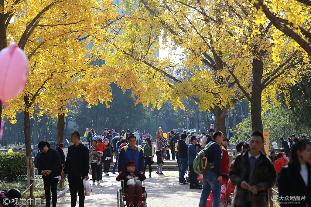 2018年11月10日,濟(jì)南動物園內(nèi),銀葉呈現(xiàn)出醉人的金黃色,市民利用周末時間前來拍照、賞景。