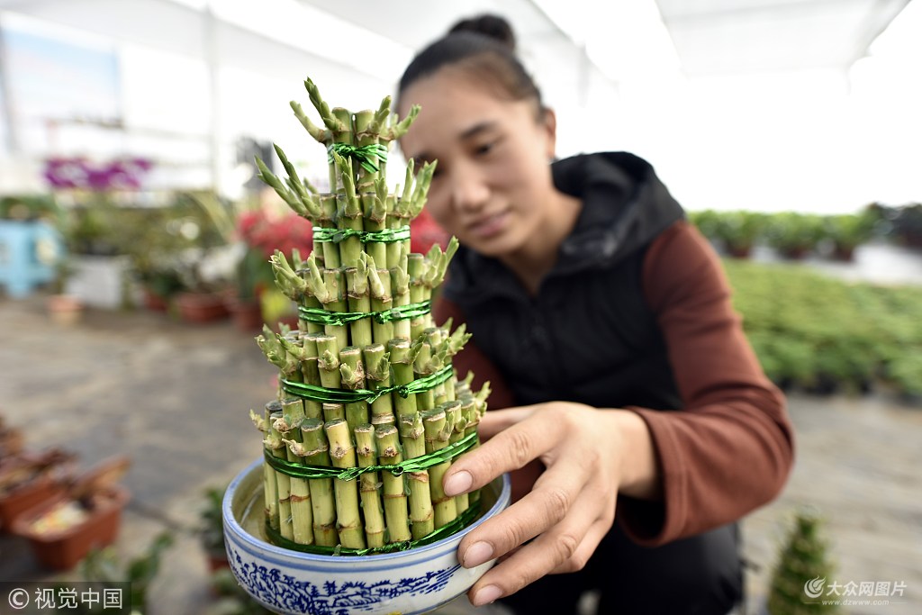 2018年11月14日,在山東省聊城市茌平縣楊屯鄉(xiāng)滿城芳花卉園,90后青年曹紅霞在查看花卉轉(zhuǎn)運(yùn)竹的長(zhǎng)勢(shì)。