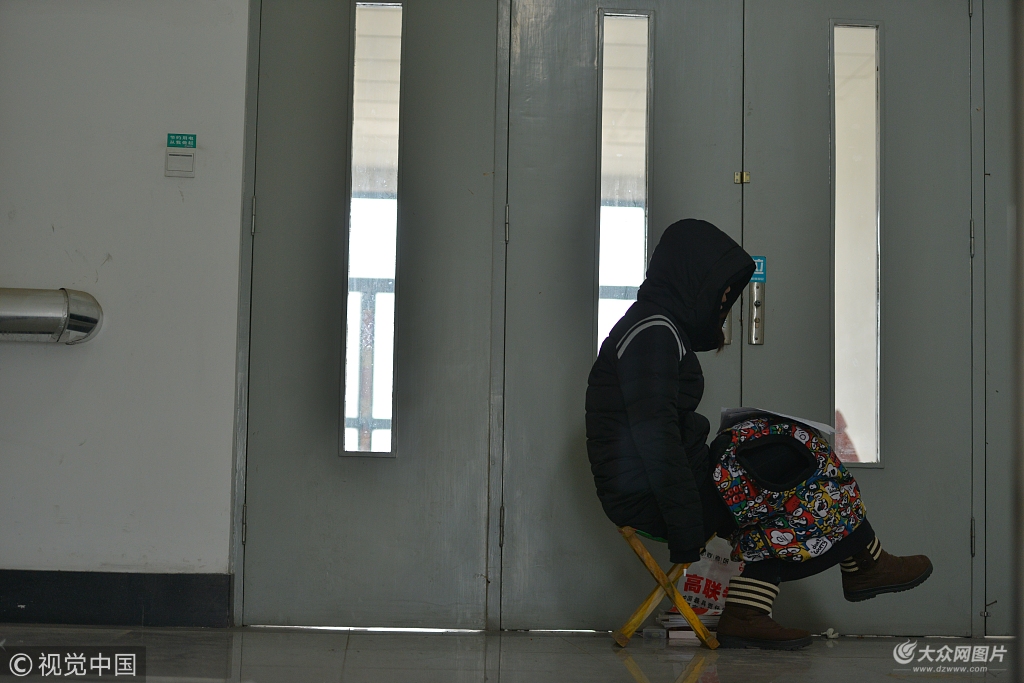 2015年12月1日,山東濟南,一高校教學樓走廊里,大批“考研族”正在緊張備考。由于天氣寒冷,不少考生身披毛毯,拿馬扎坐在走廊上苦讀。