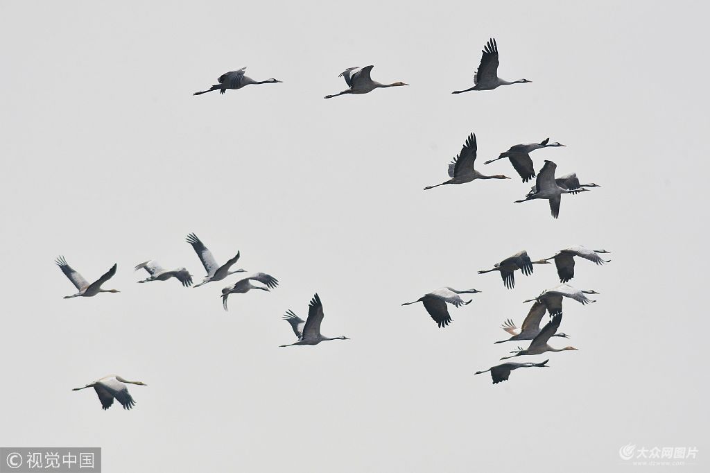 2018年11月29日,在青島膠州灣濕地灰鶴群越冬覓食畫面。