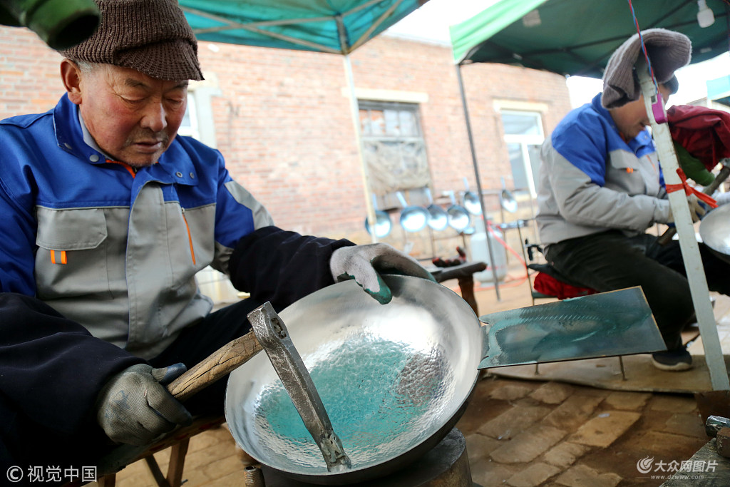 2018年12月9日,山東濟南章丘區普及集鎮一處手工鐵鍋制作廠。走進手工生產廠,廠房內傳出叮叮鐺鐺敲打鐵鍋聲音,據現場一位老師傅介紹這里鐵鍋從“砸上章丘xx號”有了唯一身份證開始,再經過數十道工序,上萬錘敲打才能打造出一口灶臺好鍋。