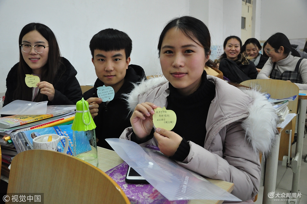 2018年12月13日,山東德州,德州學院數學科學學院大四考研學生展示收到的祝福卡片。