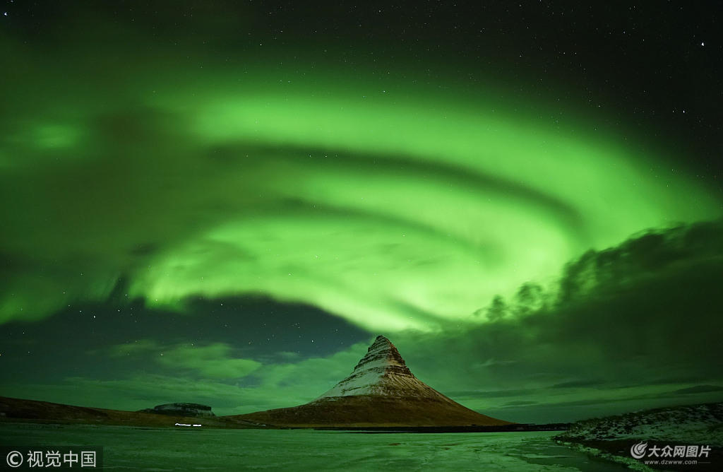 冰島西海岸高463米的Kirkjufell山上空出現(xiàn)極光,湖泊山峰極光交相輝映宛如夢境。