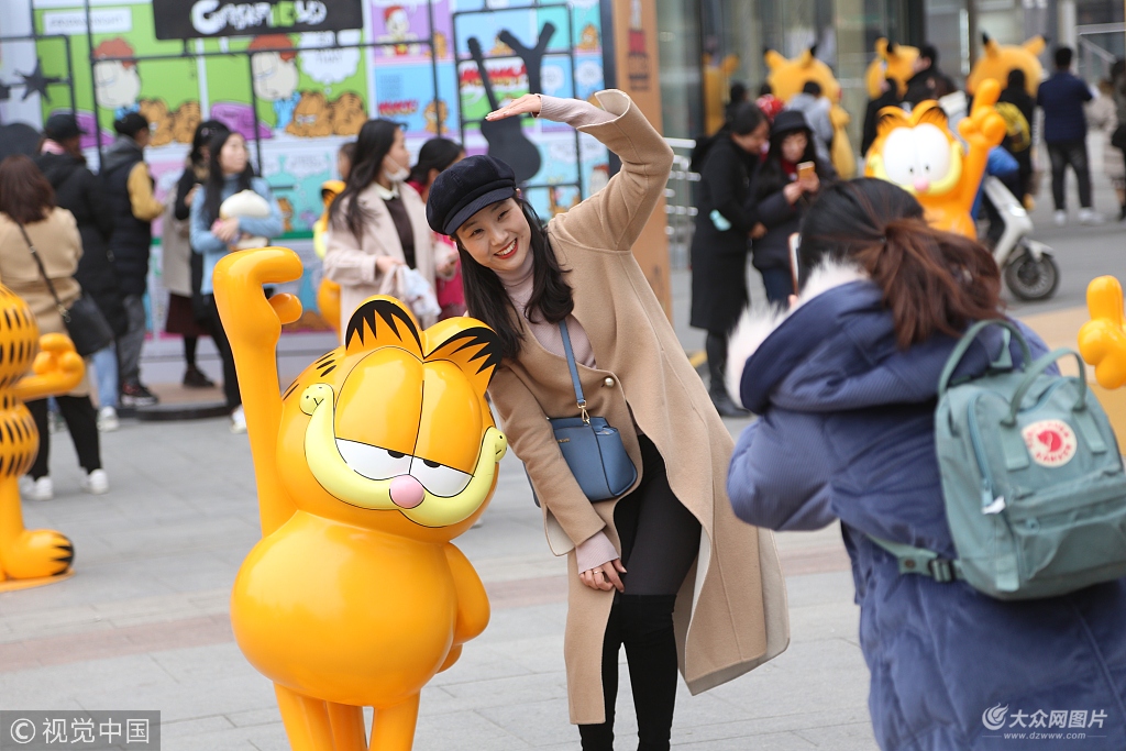 2018年12月22日,在濟南世茂廣場,20余只可愛的加菲貓造型亮相,引路過市民爭相與其合影。圖片作者:聶海石/視覺中國