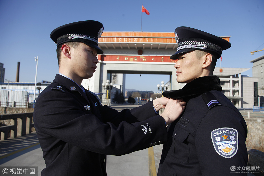 2019年1月1日,吉林延邊,新?lián)Q上人民警察制服的邊檢民警互相整理警容風(fēng)紀(jì)。