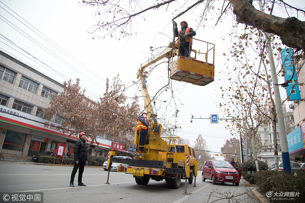 2019年1月7日,山東棗莊,針對道路兩邊部分樹枝嚴重遮擋路燈、對過往行人車輛造成安全隱患的情況。園林管理處組織專業技術人員開始對城區行道樹進行全面修剪。