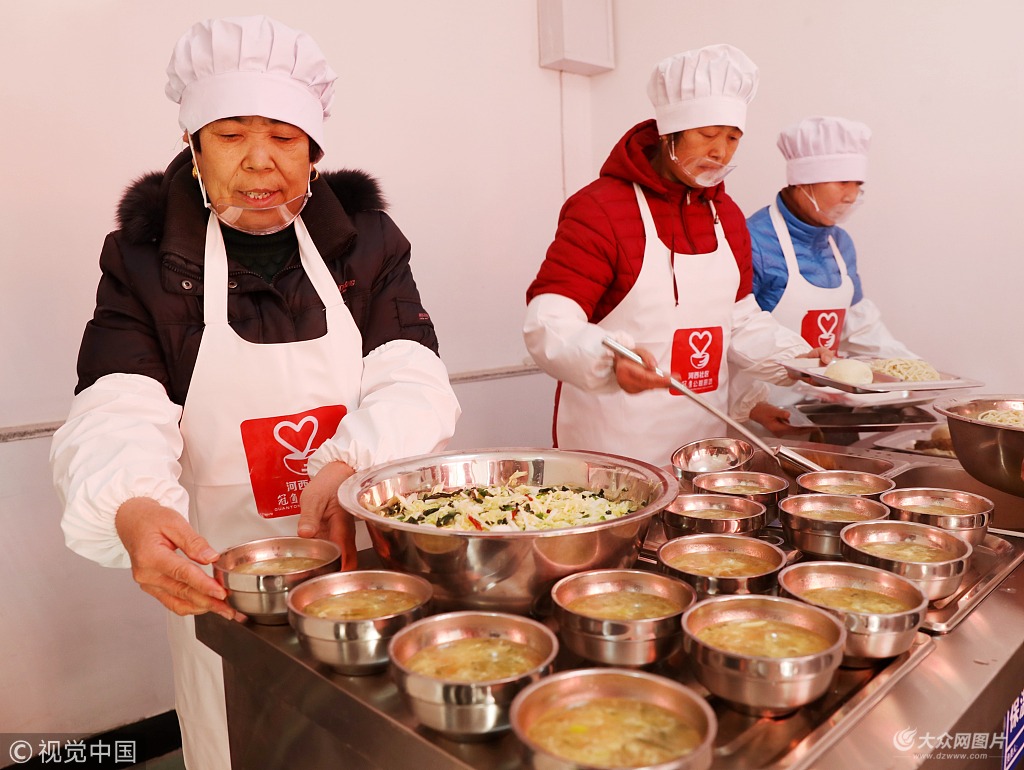 2019年1月10日,在山東威海榮成市崖頭街道河西社區(qū)冠通公益廚坊,志愿者正在給老人分餐。
