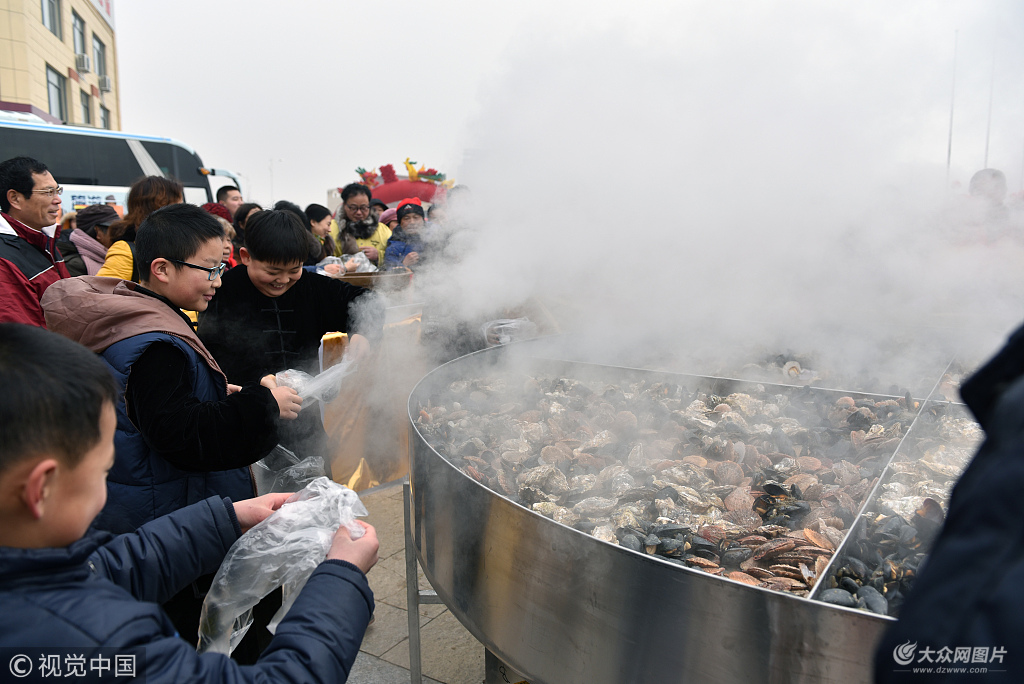 2019年1月12日,游客在山東省乳山市海陽所鎮德泰銀海商貿城圍觀熱氣騰騰的“大鍋海鮮”,準備免費品嘗牡蠣盛宴。