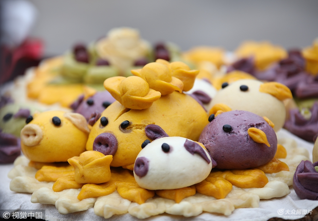 2019年1月12日,山東省日照市奎山街道舉行第三屆花饃大賽。32名巧手媳婦將自己精心制作的花饃端到比賽現場。
