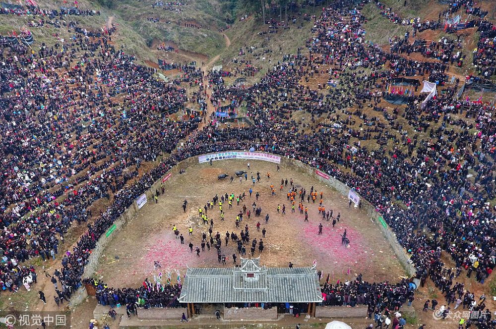 1月14日,在貴州省黔東南苗族侗族自治州從江縣四寨河口斗牛堂舉行一場別開生面的傳統斗牛活動,來自四面八方的人們在觀看斗牛,喜迎新春的到來。
