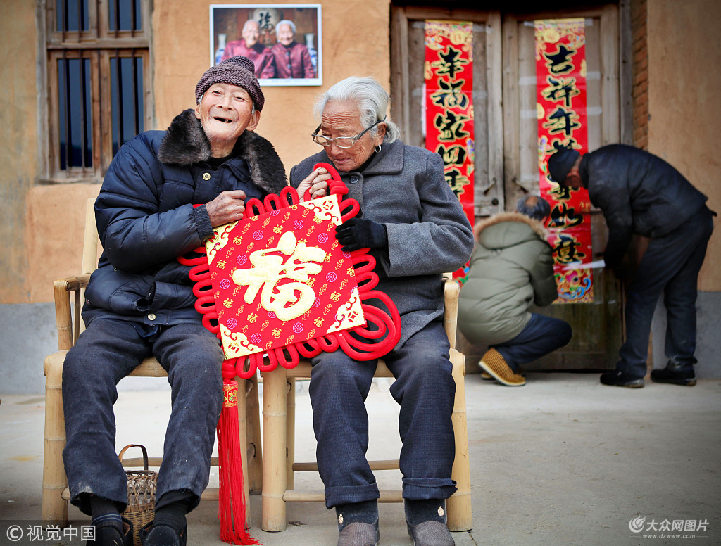 2015年2月1日,浙江麗水,龍泉市蘭巨鄉仙仁村,養老服務中心的管理員和一些村民為村里的這對浙江省唯一一對百歲夫妻季盛康、柳先秀帶去新春祝福與慰問,并幫他們貼上新春對聯。