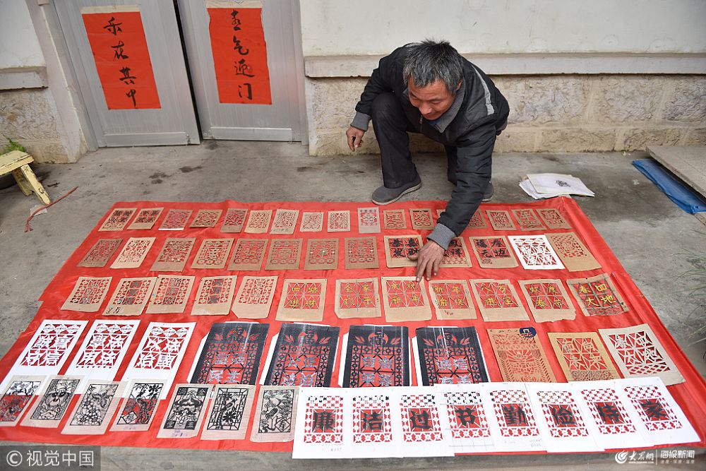 2019年1月30日,山東日照,今年53歲的史龍江是莒縣閻莊鎮(zhèn)大柏林村村民,同時(shí)他也是莒縣“過門箋”市級(jí)非物質(zhì)文化遺產(chǎn)代表性傳承人之一。他從19歲開始自立門戶制作“過門箋”,至今已經(jīng)堅(jiān)守這門手藝34年。