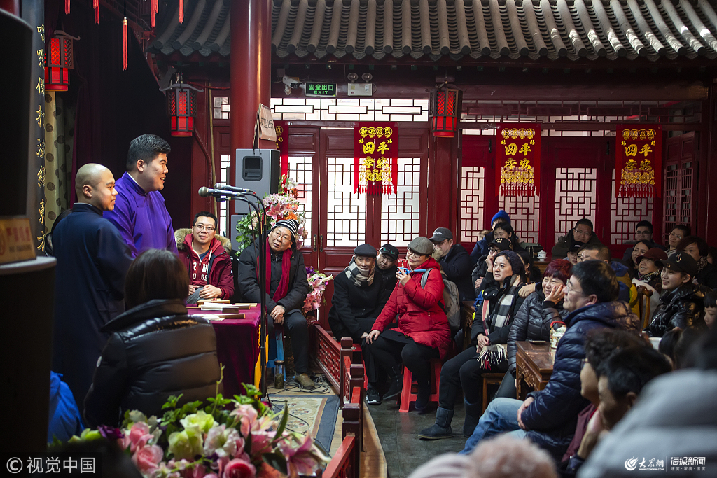 2019年2月7日,天津鼓樓。天津傳統相聲作為天津打造特色旅游的主打產品,在春節期間吸引了眾多游客,春節演出場場爆滿,座無虛席,加座游客甚至坐到了演出臺上,與演員同臺,精彩的演出得到全國各地游客的熱烈喜愛和強烈推薦。