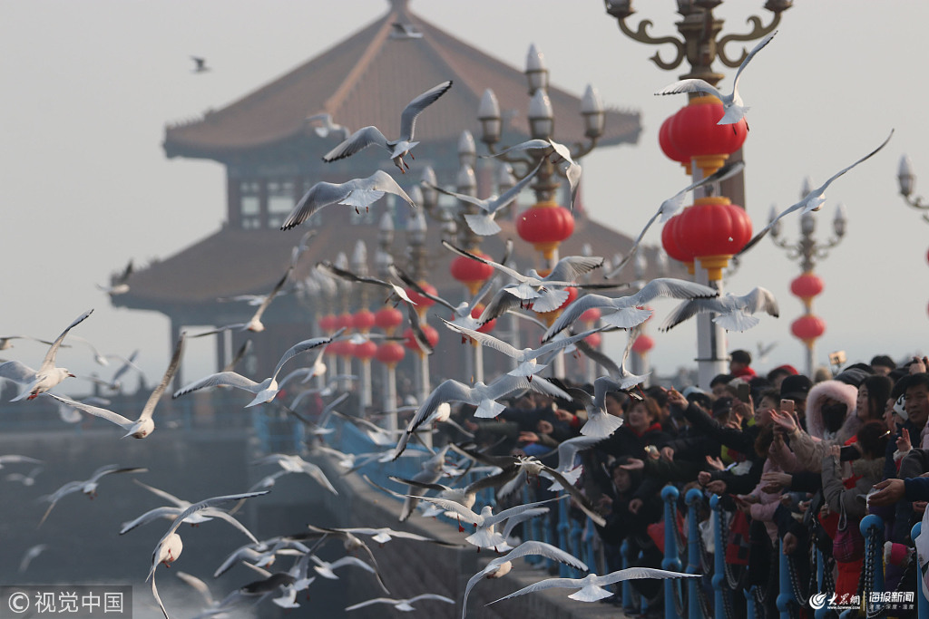 2019年2月11日,游人在山東省青島棧橋景區(qū)賞海鷗。
