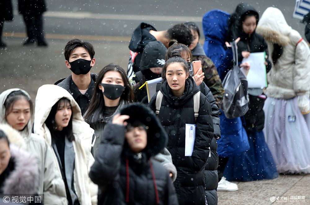 2019年2月18日,濟南,泉城迎來第二場春雪,在山東藝術學院藝考點,眾多女考生貼身穿著婚紗或晚禮服,外面套著厚厚的棉衣,在風雪中趕考。