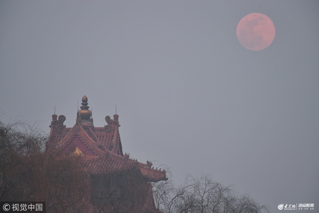 2019年2月19日,北京,元宵節恰逢超級月亮,傍晚六點月亮從角樓上方升起。