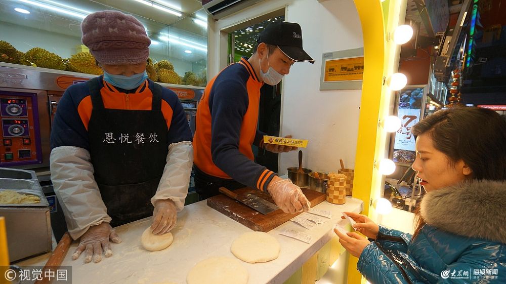 2019年2月18日,山東臨沂,在蘭山區美食街內有一家十分火爆的“榴蓮芝士餅店”,據臨沂本地人說他家的榴蓮餅是最正宗的。