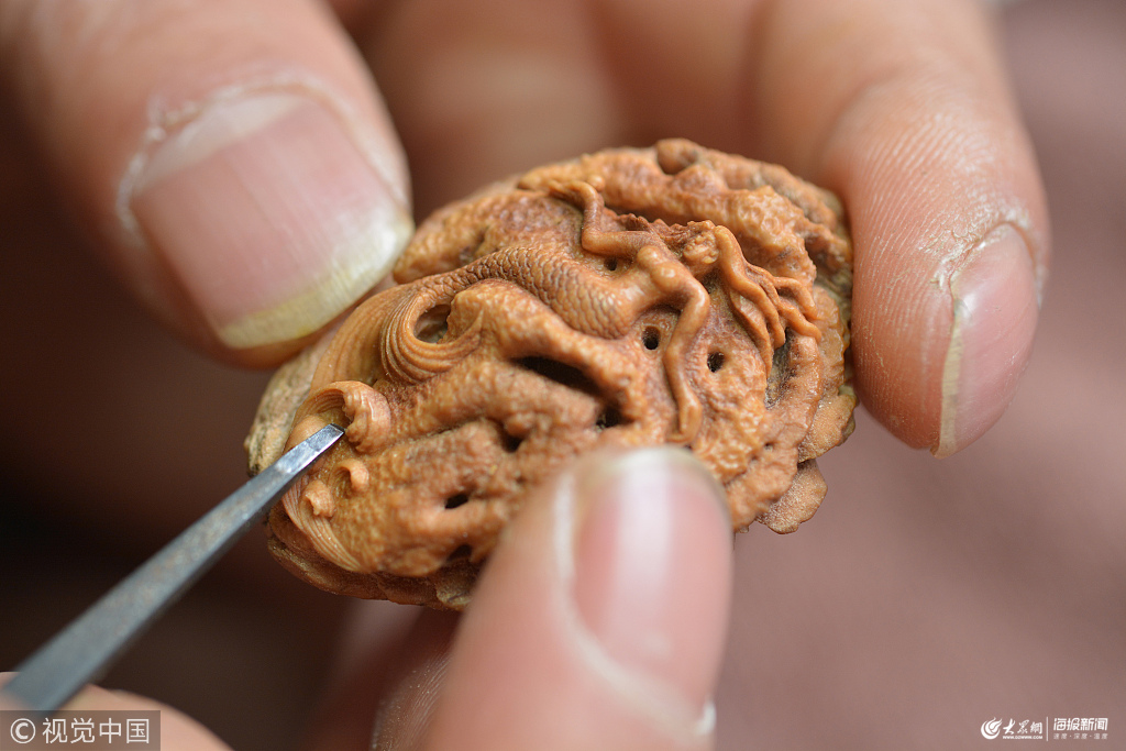 山東日照:男子辭職專做桃核微雕 一件作品賣上萬元