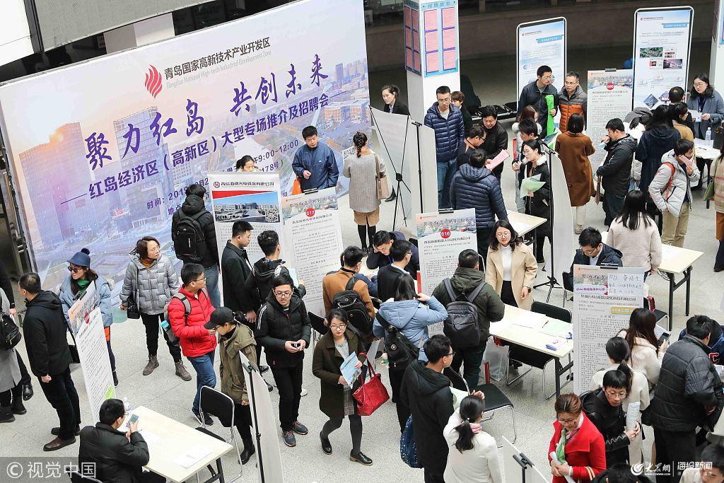 2019年2月27日,求職者在2019青島市紅島經(jīng)濟區(qū)(高新區(qū))大型專場推介及招聘會上查看招聘信息。