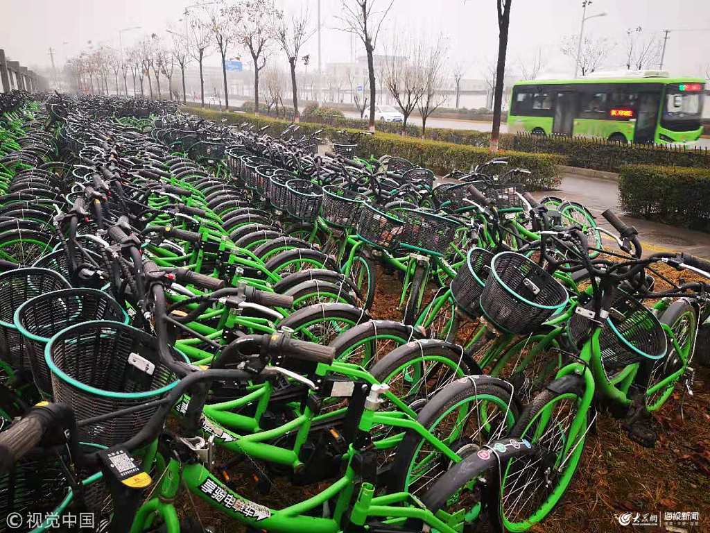 西安上千輛電動共享單車存放在綠化帶內(nèi)