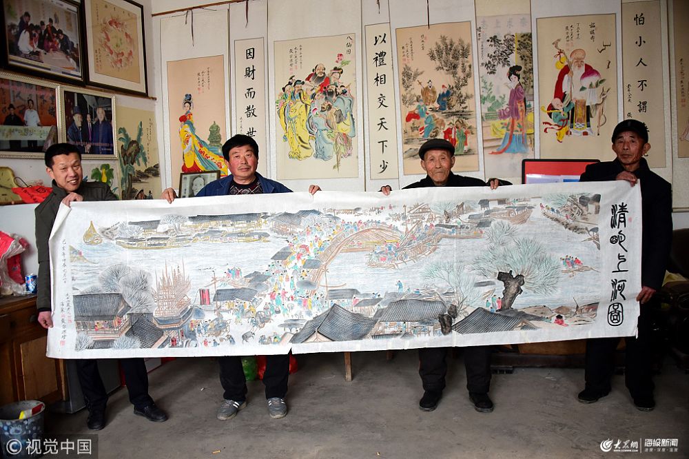 近日,聊城平縣杜郎口鎮張海子村今年94歲的董莊中堂畫非遺傳承人之一的張宗源老先生,經過近20天的描繪,將中國十大傳世名畫之一的《清明上河圖》局部圖繪就完成,該幅畫長3.20米,高1.00米,該畫作一經完工就受到了書畫愛好者的喜愛,紛紛前去家中觀展。