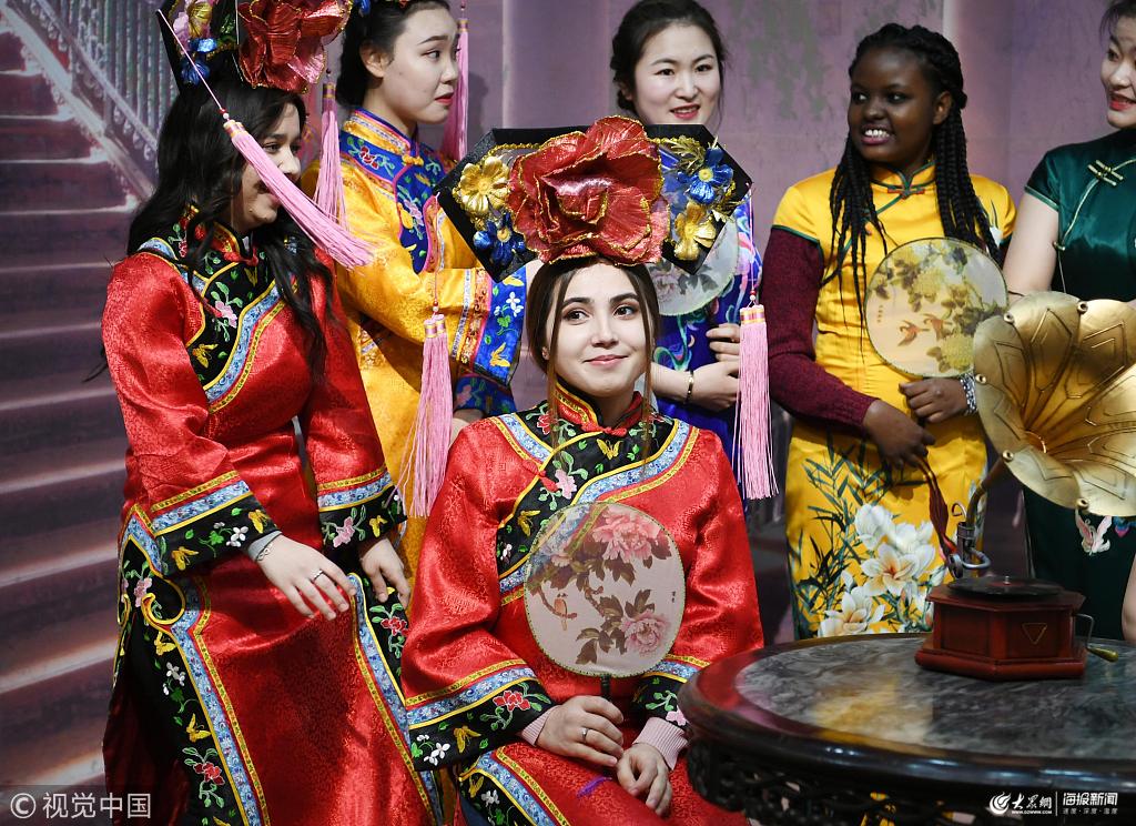 2019年3月8日,在吉林長春偽滿皇宮博物院,來自異國的留學生們身穿旗袍、滿族民族服裝,感受中國女性傳統服飾的魅力。 張瑤(吉林分社)/中新社/視覺中國