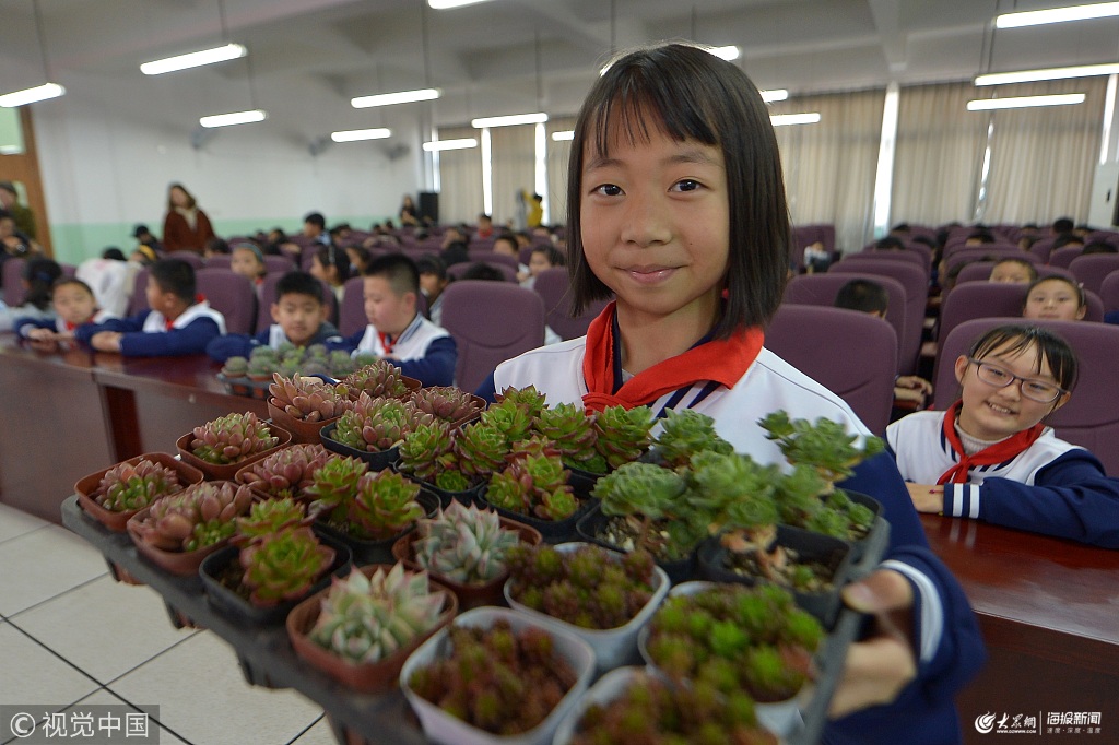 2019年3月12日,一名青島立新小學的學生展示在植樹節“書香換花香”活動中收到的綠植。