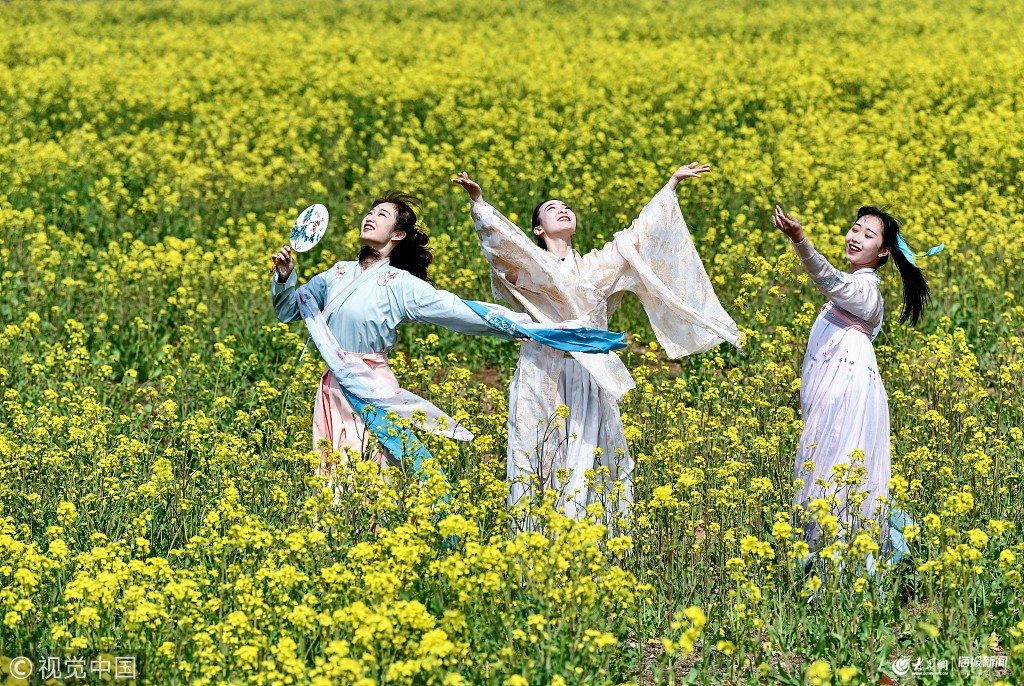 2019年3月24日,身穿漢服的女孩在山東省棗莊市臺兒莊古城景區油菜花海踏春賞花。