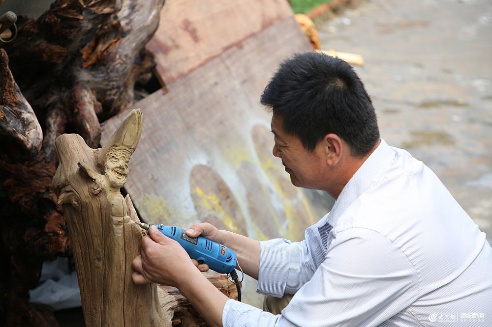 2019年6月8日,山東日照,五蓮縣洪凝街道莫家莊子村,在一場大雨過后,閑不住的鄭淑強(qiáng)又開始了自己的雕刻時間。一尊“濟(jì)公”形象的根雕在鄭淑強(qiáng)的打磨下,栩栩如生地展現(xiàn)在人們面前。