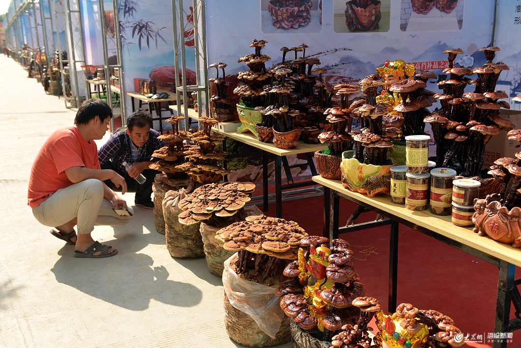 2019年6月14日,山東聊城,客商在冠縣靈芝文化產(chǎn)業(yè)園欣賞靈芝盆景。當(dāng)日,山東聊城冠縣第二屆靈芝文化節(jié)在冠縣店子鎮(zhèn)舉行。