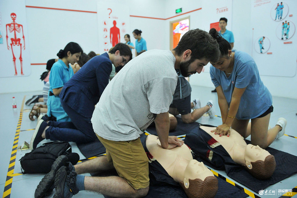 2019年7月5日,青島,山東科技大學中外大學生走進山東海麗應急安全培訓中心,學習和體驗煙霧逃生、地震自救、結繩自救、模擬消防滅火、交通安全、心肺復蘇等應急自救和逃生技術和技巧。通過“體驗式”應急安全培訓模式,讓安全知識與體驗、互動充分融合,增強中外大學生的應急安全意識和技能。