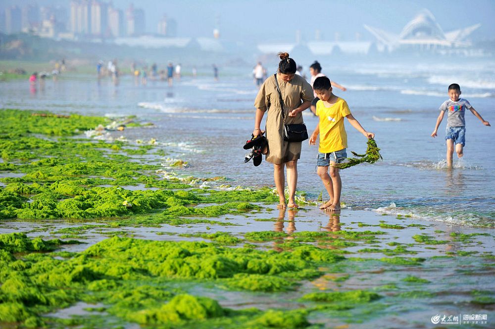 2019年7月7日,山東青島一沙灘,游客在堆積有滸苔的岸邊游玩。
