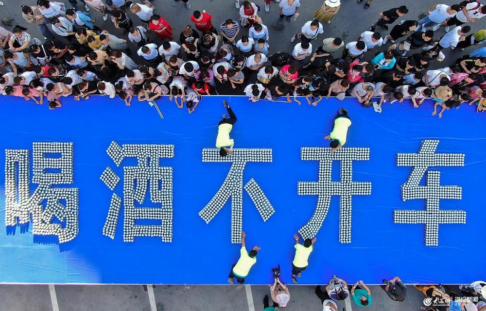 7月6日傍晚,河南洛陽重渡溝舉行千人酒王爭霸賽,吸引上千人參與角逐拼酒王拿大獎,各個選手斗志昂揚,喝啤酒大戰一觸即發,在斗酒開始之前,現場的司機們卻和交警一起,來到有數千個易拉罐啤酒拼成的“喝酒不開車”的警示語前,面對自己的家人,跟著交警向家人立誓“為了自己家人和他人的幸福,遵守交通法規,喝酒不開車”。