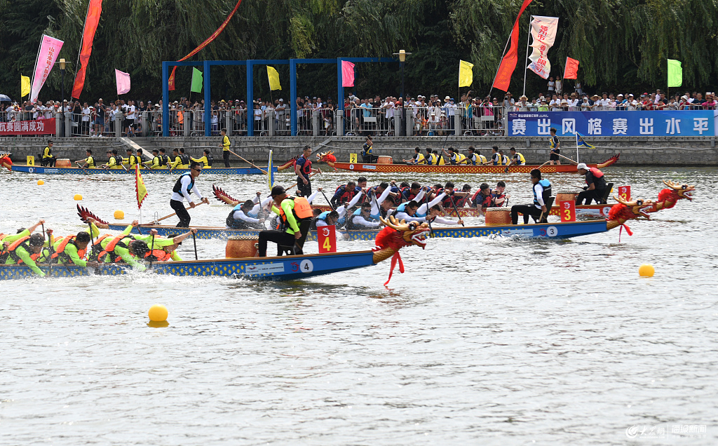 2019年6月22日,山東棗莊,參加“縱橫江湖”山東省城市龍舟對抗賽的參賽隊伍在滕州荊河水域比賽中。為期兩天的“縱橫江湖”山東省城市龍舟對抗賽在棗莊滕州荊河舉行,精彩的龍舟賽事,讓當(dāng)?shù)厥忻翊箫栄鄹!?/p>